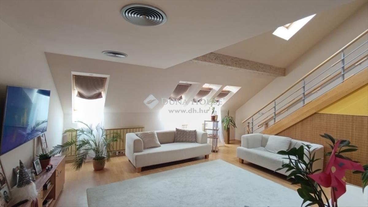 A 127m2-es tágas tetőtéri két szintes lakás várja új tulajdonosát. Miért jó a belvárosban lakni? Mert minden egy karnyújtásnyira van, hivatalok, boltok, bankok, piac. De a Duna is csak pár lépés, ha esti sétára indulnánk. Ahogy belépünk a lakásba kényelmesen bepakolhatunk egy egész falat elfoglaló praktikus beépített szekrénybe. Innen nyílik a a konyha, és az étkező amit egy pult választ el a hatalmas nappalitól. a nappali különleges belmagassága, bevilágító ablakai miatt napfényes különleges hangulatot áraszt. a fürdőszobában nagy sarokkád, és hangulatos fürdőszobabútor nagy tükörrel várja új tulajdonosát. a wc külön helyiségben van. a hálószoba körablaka extra megjelenést kölcsönöz a helyiségnek. a földszinten még egy szoba van. a hangulatos lépcsőn juthatunk fel a galériás emeleti helyiségekbe, itt két szoba van. a galérián kapott helyet a klíma is így kellemes hőmérsékletet biztosít nyáron is a lakásban. Ajánlom ezt a lakást, családoknak hiszen több szoba van és itt mindenki elfér. Az idősebb korosztály számára is megfelelő lehet hiszen lift van a lépcsőházban. Ne hagyja ki ezt a különleges lehetőséget, hogy otthonává tehesse ezt a fényűző tetőtéri lakást. Érdeklődjön bátran, és tegye meg az első lépést álmai otthona felé még ma!