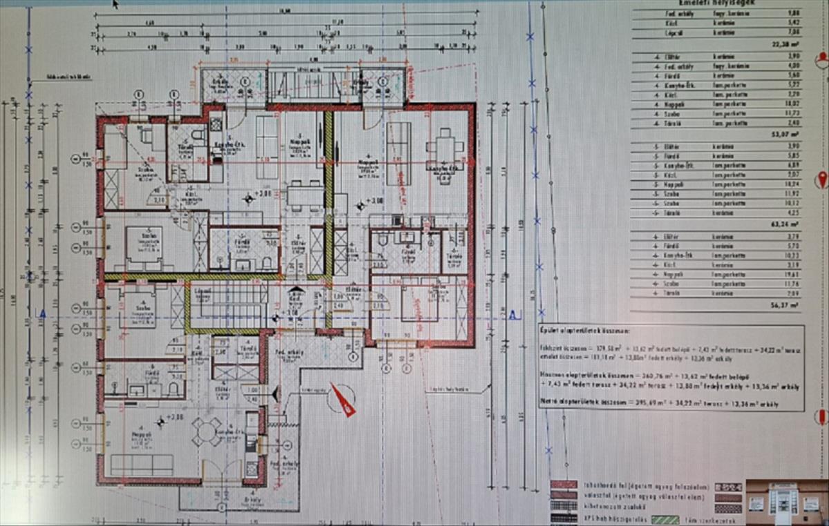 A 3. Lakás lakóterülete 56, 37 m2, melyben előtér (3, 79 m2), nappali (19, 61 m2), konyha-étkező (10, 23 m2), közlekedő (3, 19 m2), 1. Szoba (11, 76 m2), fürdőszoba (5, 70 m2), és tároló (2, 09 m2) található, valamint terasz (13, 05 m2) és fedett terasz (3, 00 m2) is kapcsolódik a nappalihoz. a lakáshoz kb 80-100 m2 telekrész tartozik.