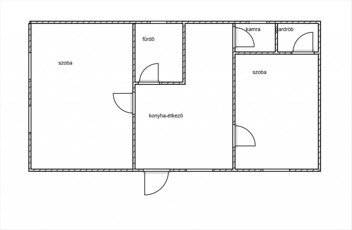 Helyiségek: Konyha-étkező (modern bútorral), zuhanyzós fürdő, két hálószoba, külön kamra és gardrób.