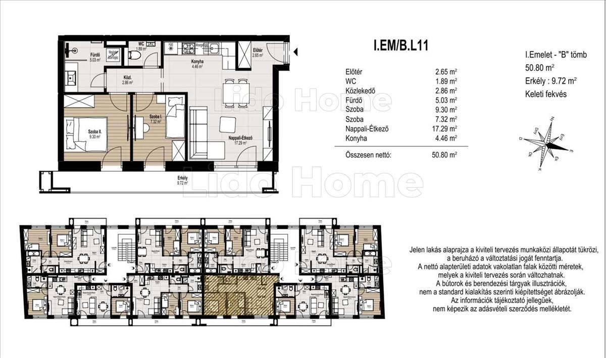 B, épület, 1. emelet, . 11. Lakás: 51, 80 m², + 9, 72 m² erkély.