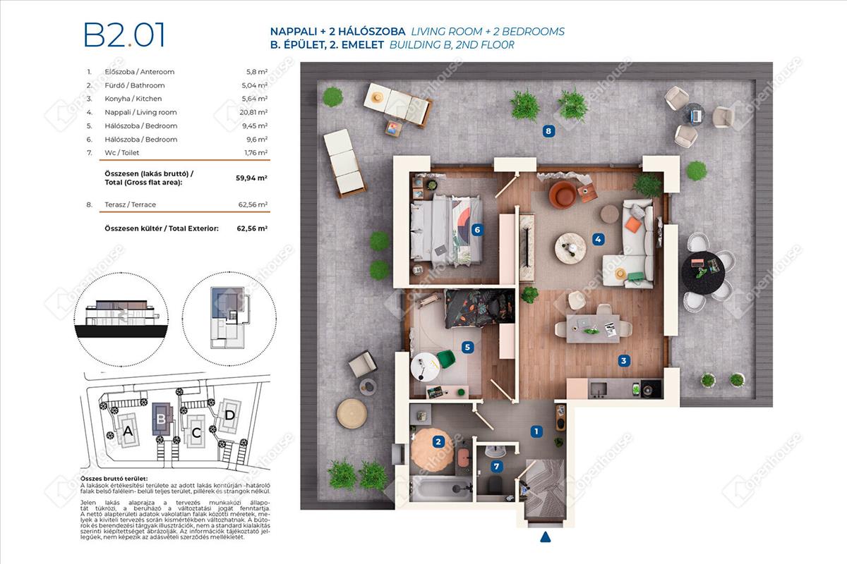 Elhelyezkedés: a „b” épület legfelső. 2. emeletén található, kívül végig terasszal övezett kialakításban, ény tájolással