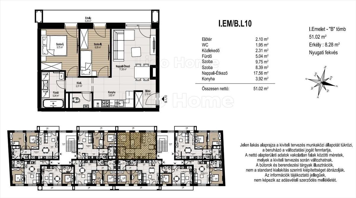 B, épület, 1. emelet, . 10. Lakás: 51, 02 m², + 8 m² erkély.