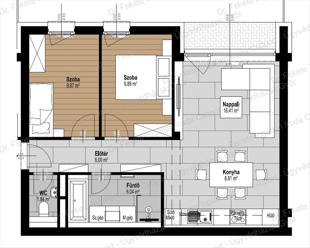 Lakótér 58, 86 nm , nappali + 2 szobás + 4 nm -es terasszal, valamint 54, 4 nm -es kerttel rendelkező lakás.