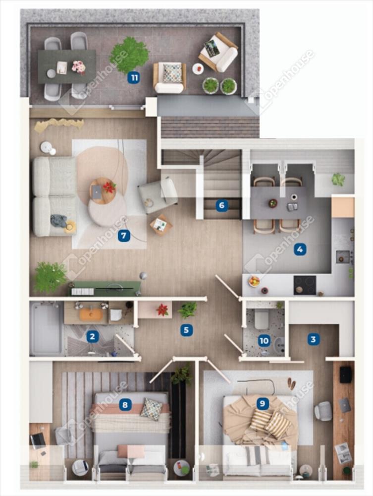 Amerikai konyhás nappali, 2 hálószoba, előszoba, közlekedő, fürdő, külön wc, gardrób, lépcső és 10, 18 m² terasz került kialakításra a lakásban.