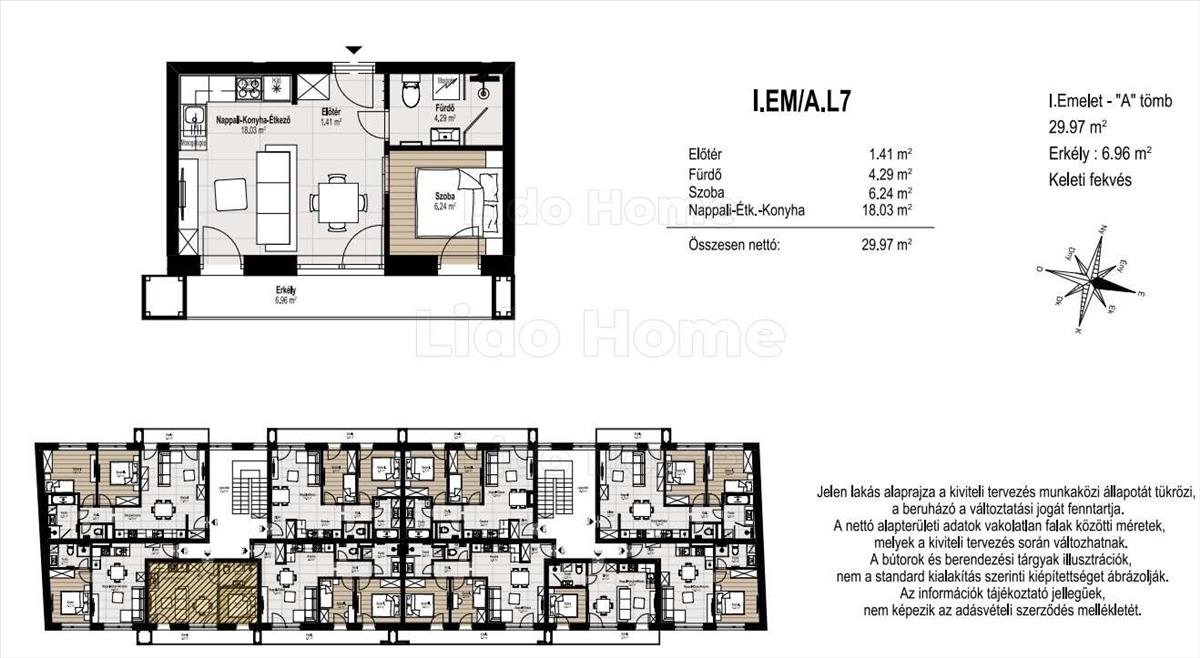 A, épület, 1. emelet, 7. Lakás: 29, 97m², + 6, 96 m² erkély.