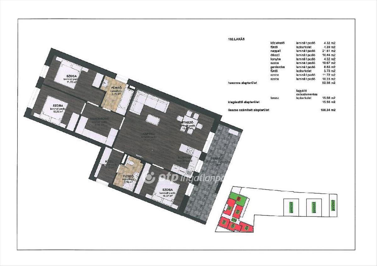 A 102. Lakás földszinti, 1+3 szobás, 100, 3 nm.