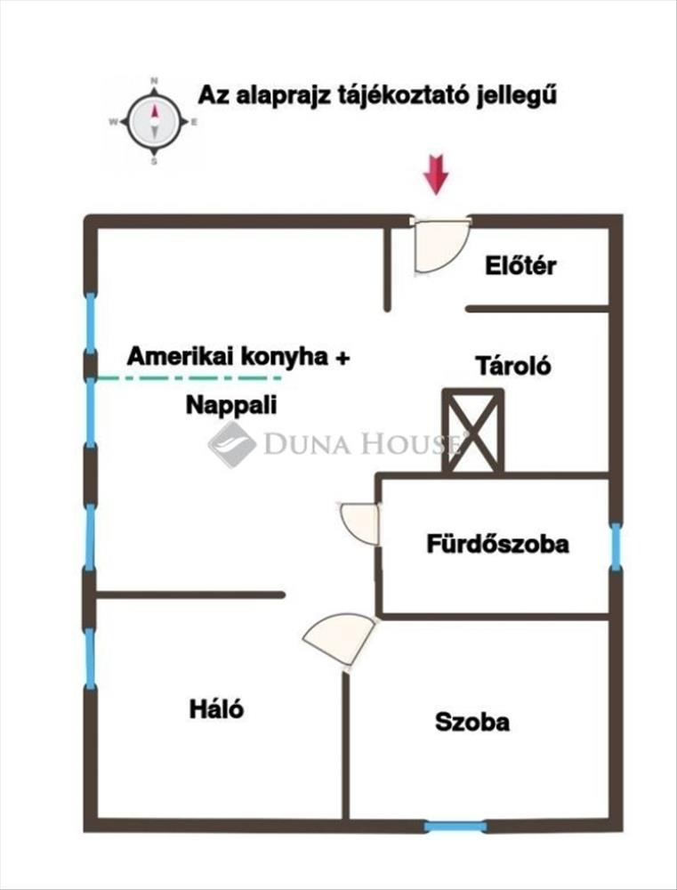 - a lakás jól kihasznált elrendezésű: külön nyíló szoba, hálórész és amerikai konyhás nappali