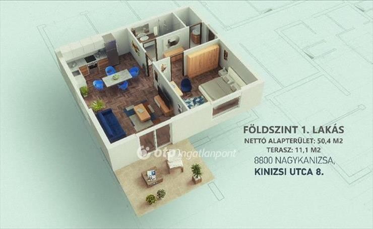 1-es lakás: földszinti, 50, 4 nm alapterület, + 11, 1 nm terasz, nappali +1 szoba, d-k tájolású