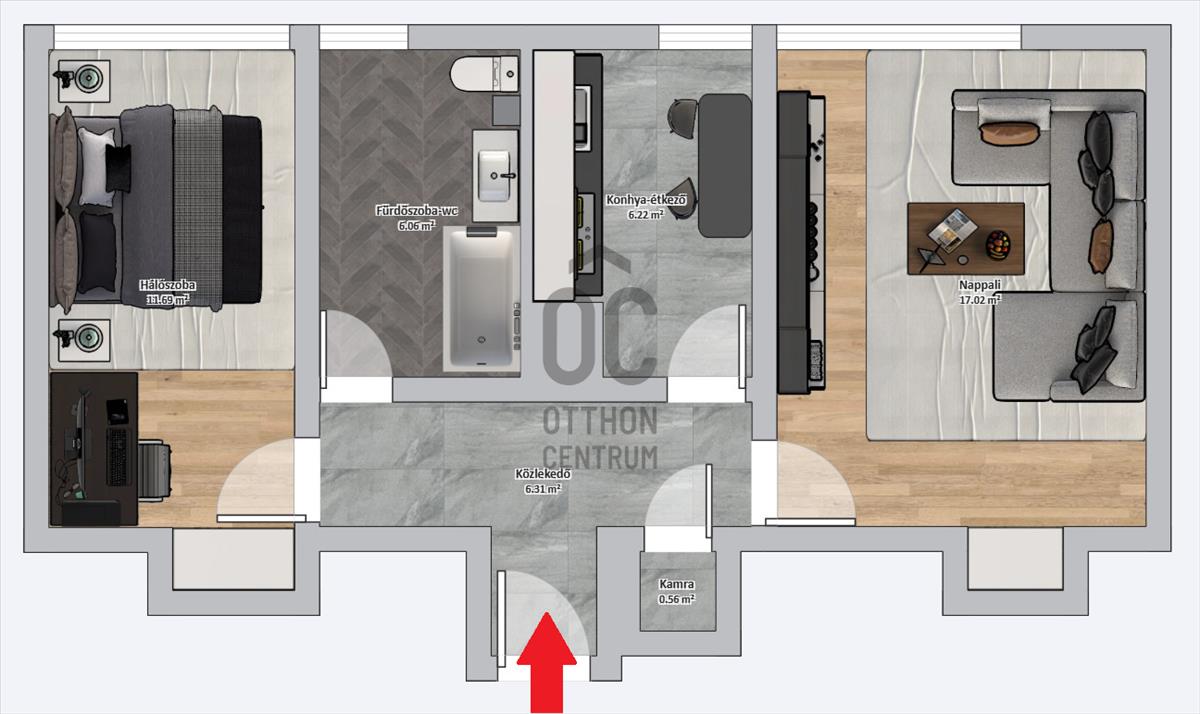 - Felosztása: közlekedő, konyha-étkező, kamra, nappali, fürdőszoba-wc, hálószoba.