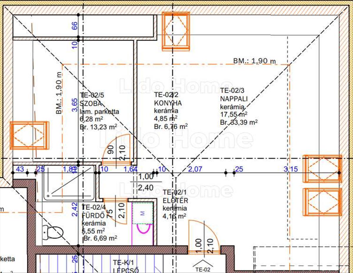 - Első emeleti, 64, 23m2 hasznos lakóterű lakás