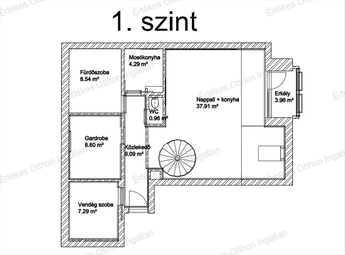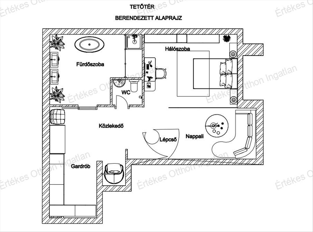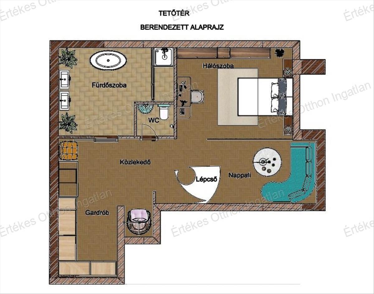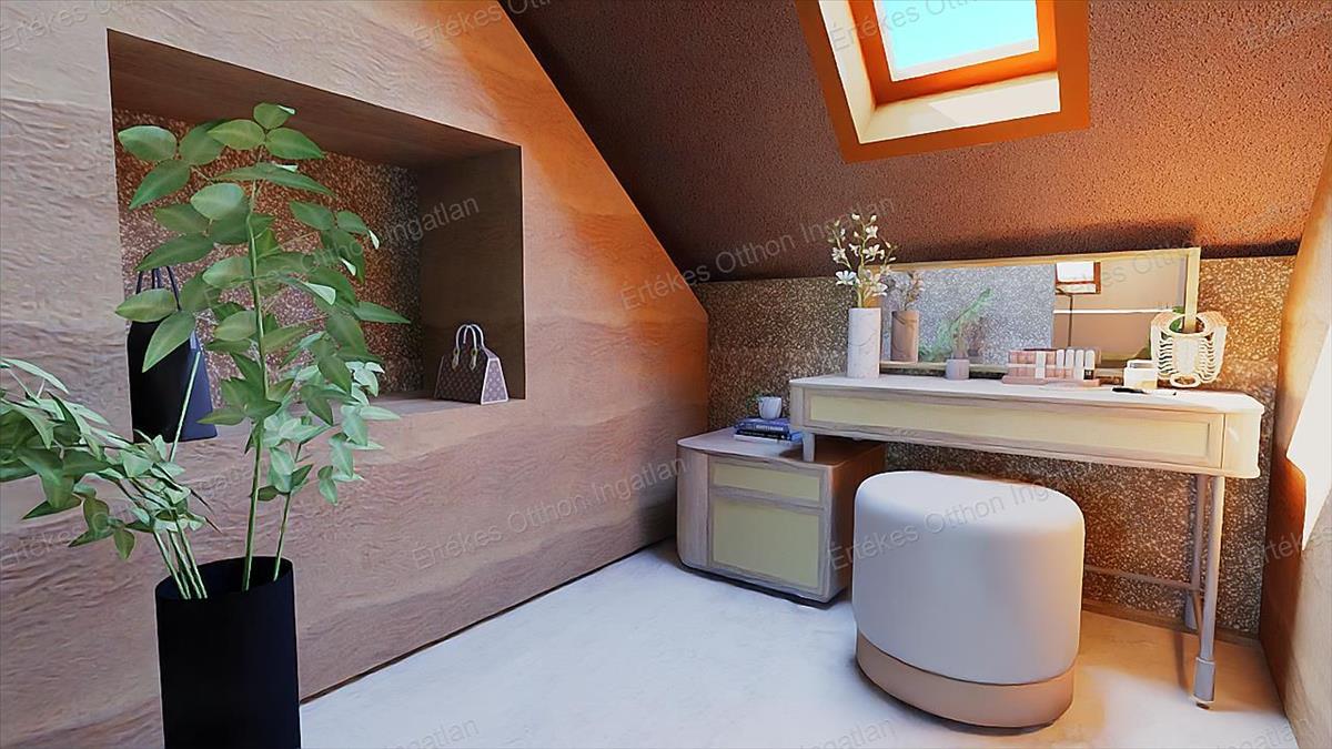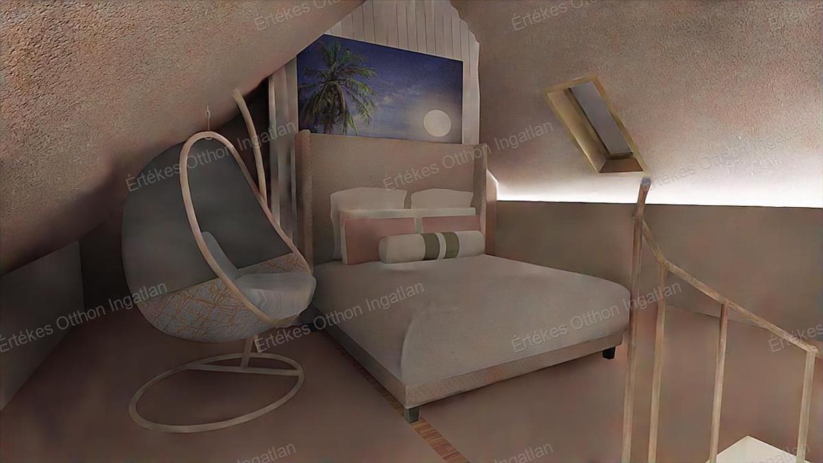 - Felső szint: nagy méretű hálószoba, gardrób, fürdőszoba mellékhelyiséggel