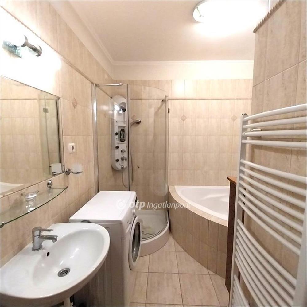 Tágas, igényes fürdőszoba sarokkáddal, zuhanyzóval és Wc-vel ellátott.