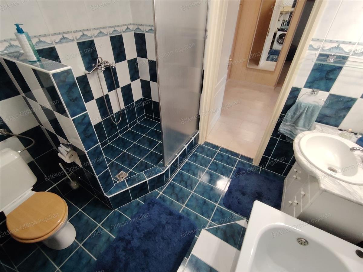 A fürdőszoba is tágas, kád és zuhanyzó egyaránt található benne.