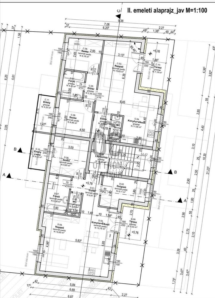 "B" lakás: 69, 58 m2 + 6, 87 m2 erkély