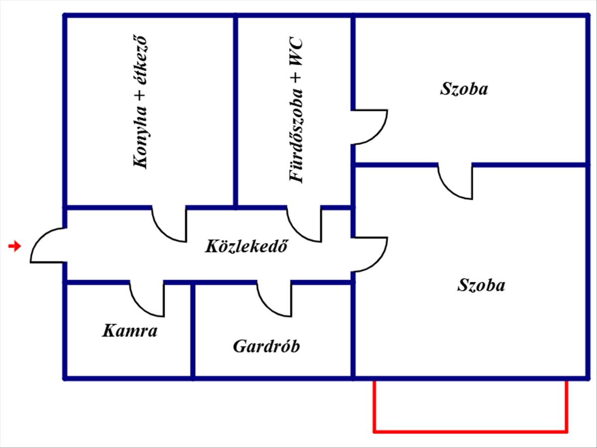 Élettér: 2 szoba, közlekedő, konyha+étkező, kamra, gardrób, fürdőszoba + wc, erkély.