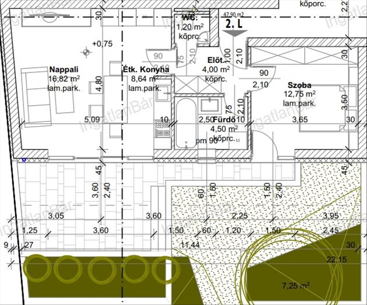 Lakótér: 47, 91 m² Terasz: 12 m² Privát udvar: 40 m² – kizárólagos használatban!