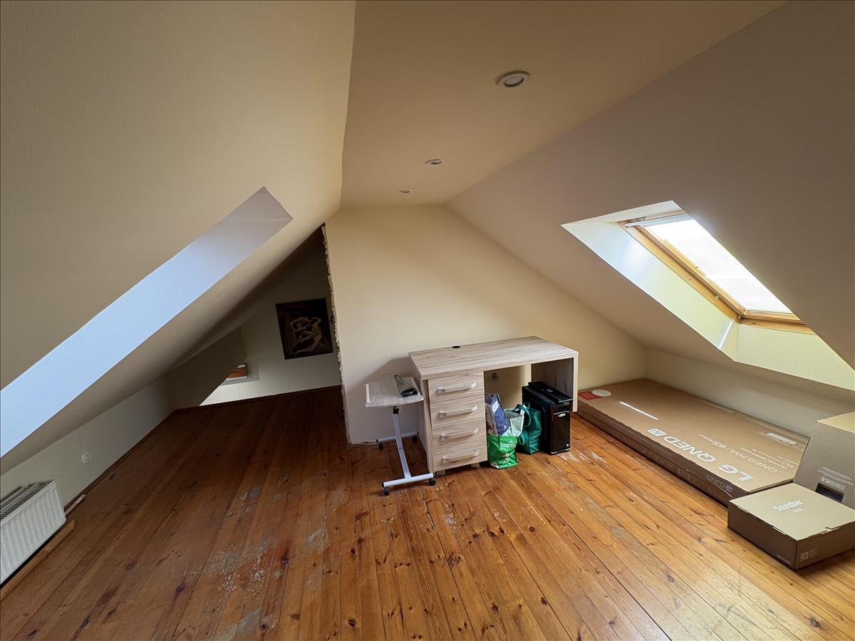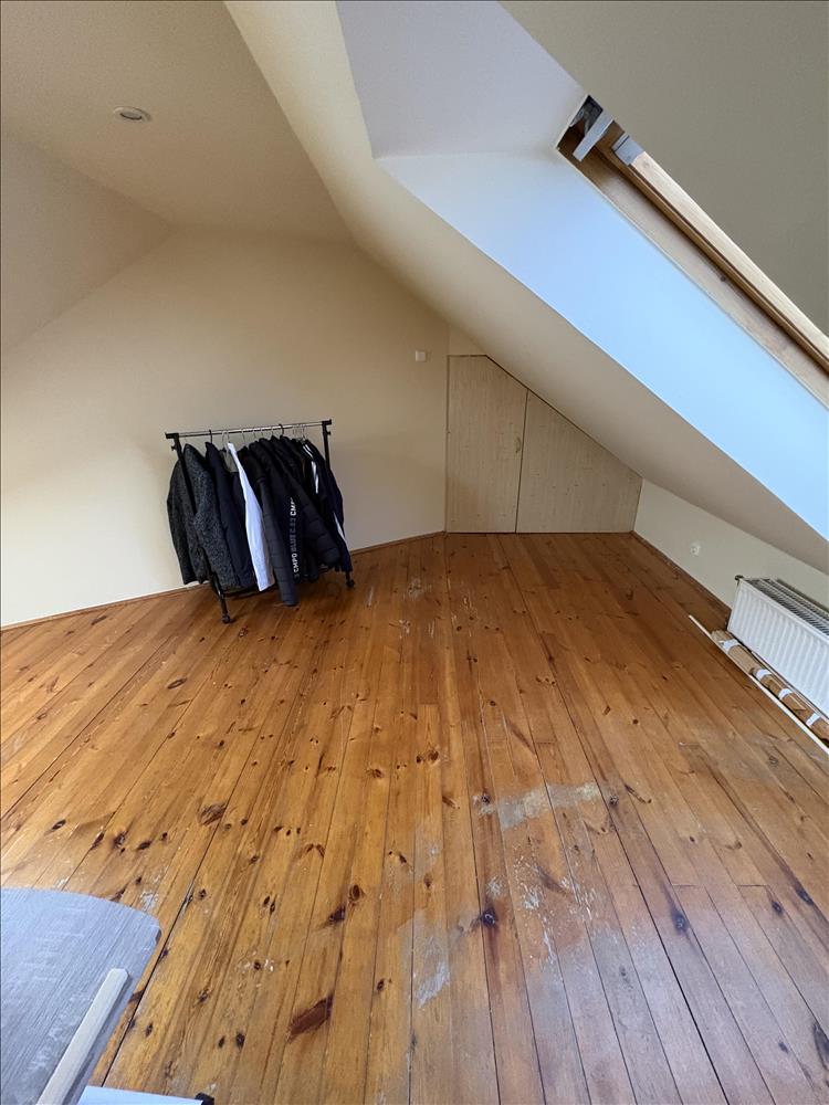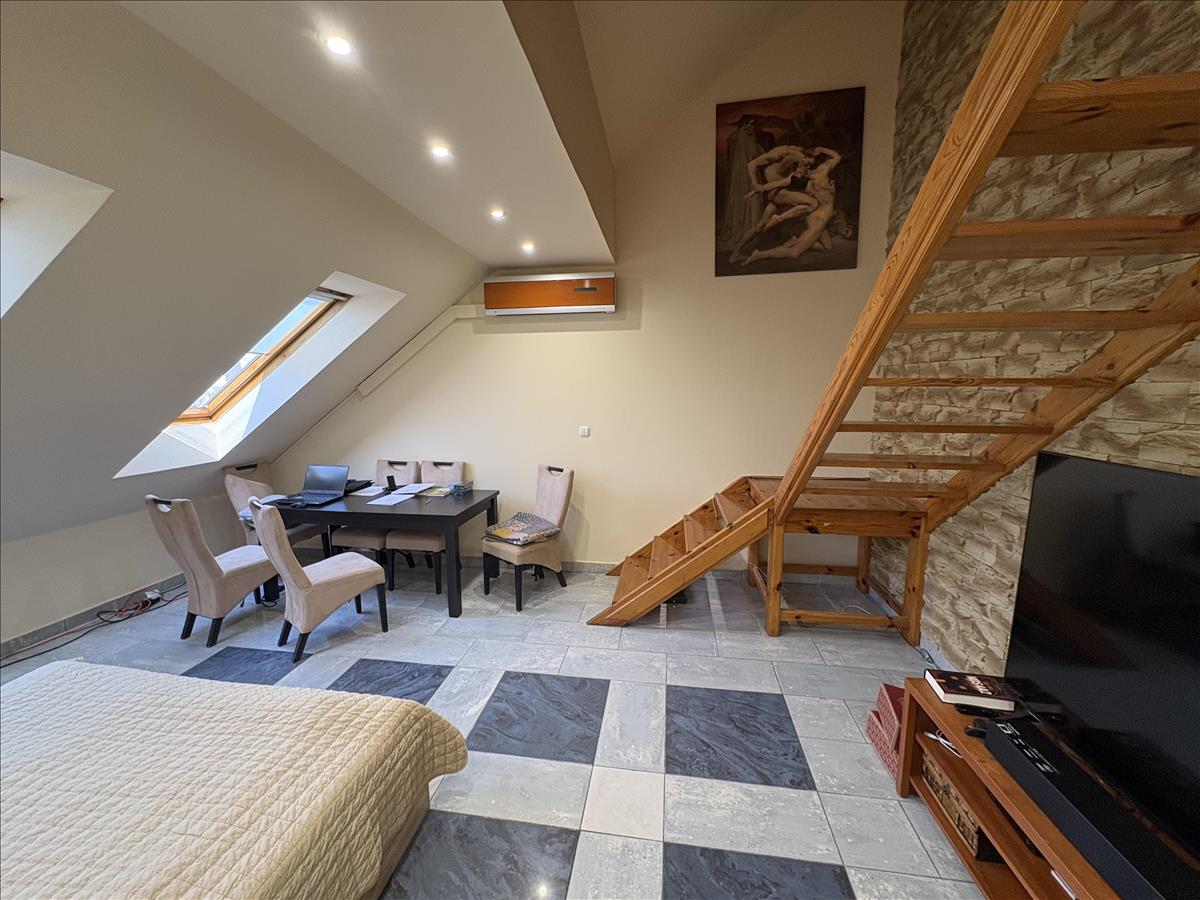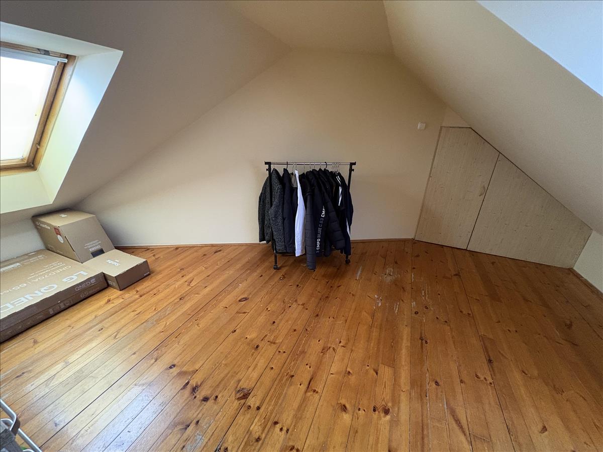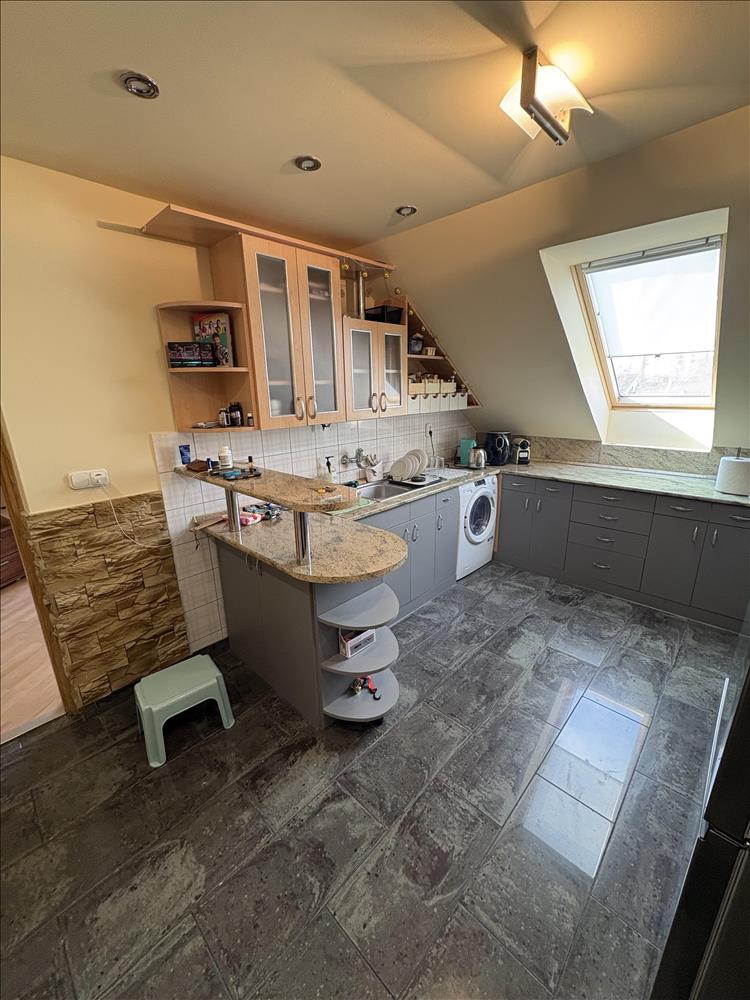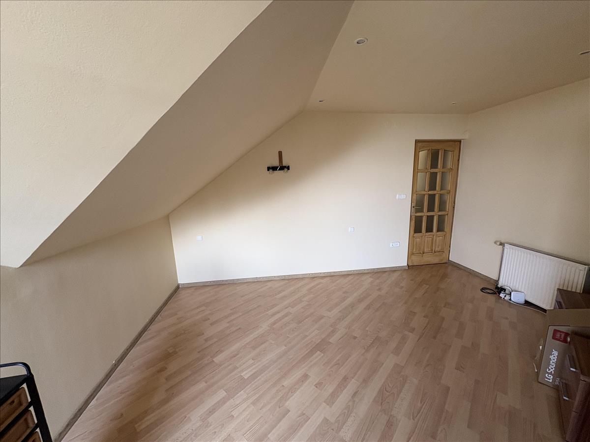 - Elosztása: Alsó szinten: előszoba, konyha, fürdőszoba+ Wc (külön helyiségben van ) nappali+ 1 szoba. Tetőtérben: 1 szoba van. Erkélye nincs a lakásnak.