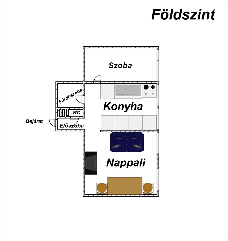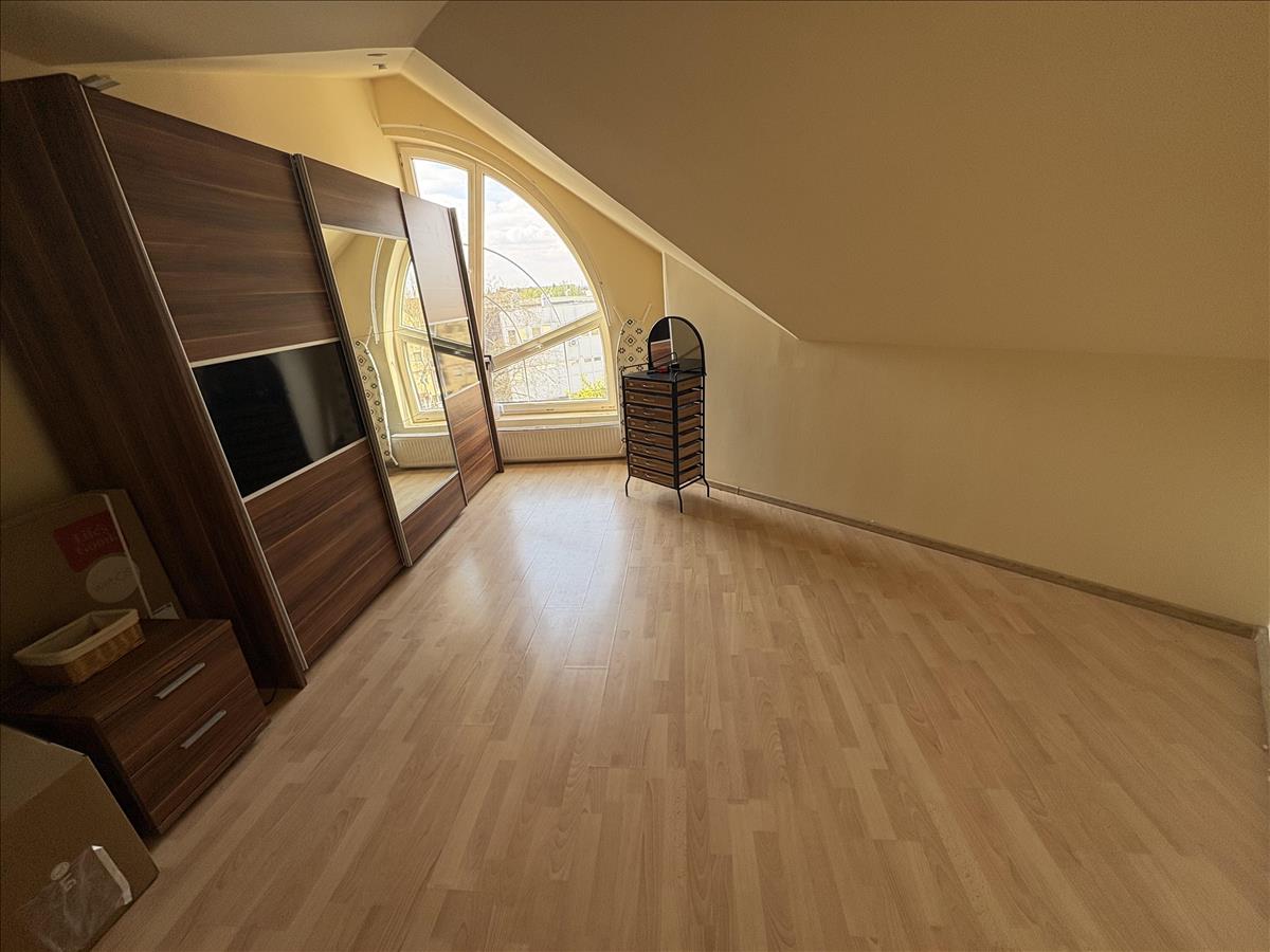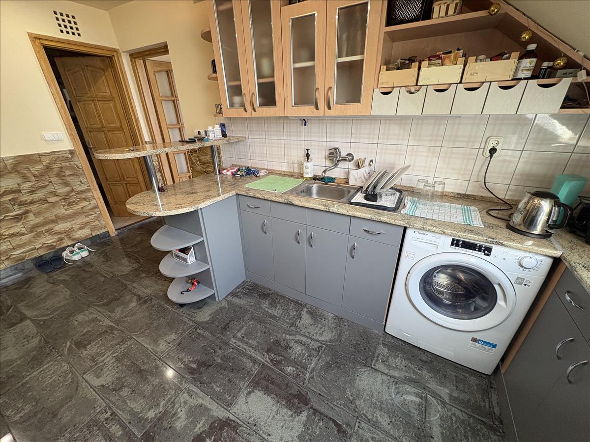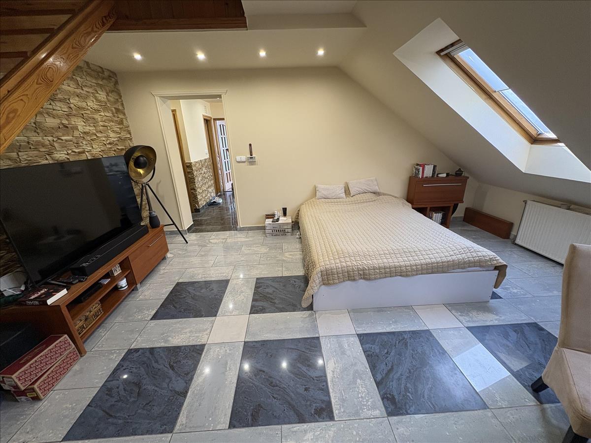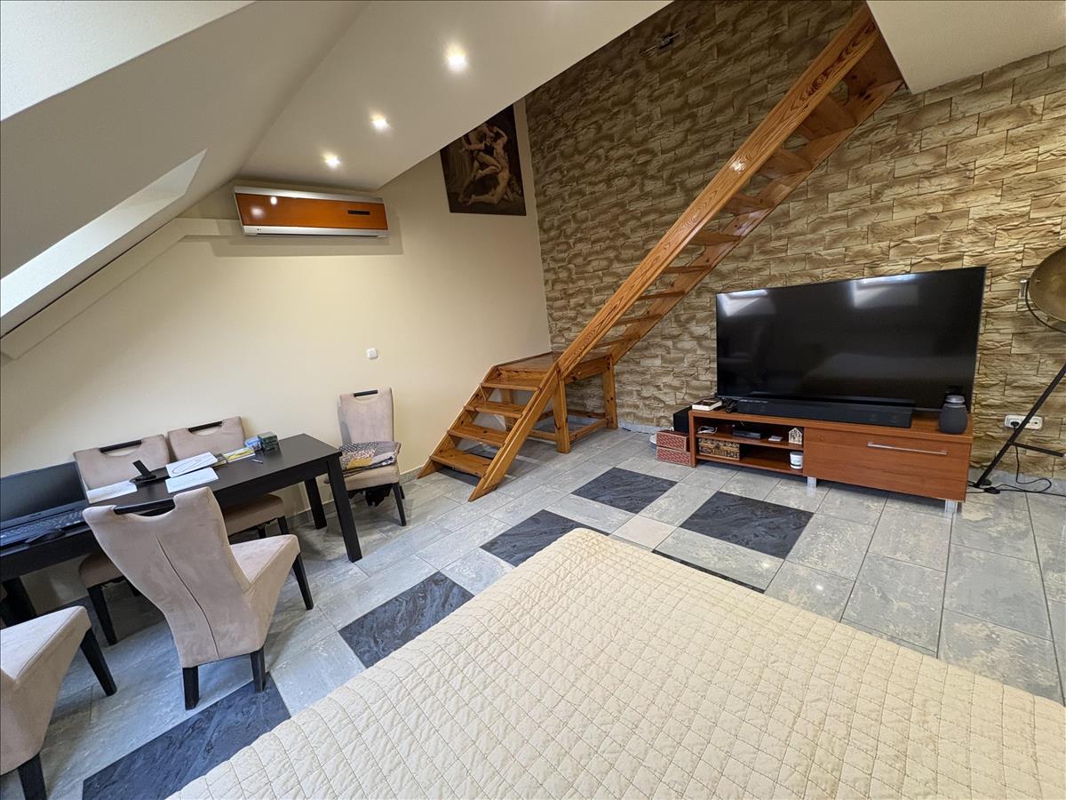 - Elosztása: Alsó szinten: előszoba, konyha, fürdőszoba+ Wc (külön helyiségben van ) nappali+ 1 szoba. Tetőtérben: 1 szoba van. Erkélye nincs a lakásnak.