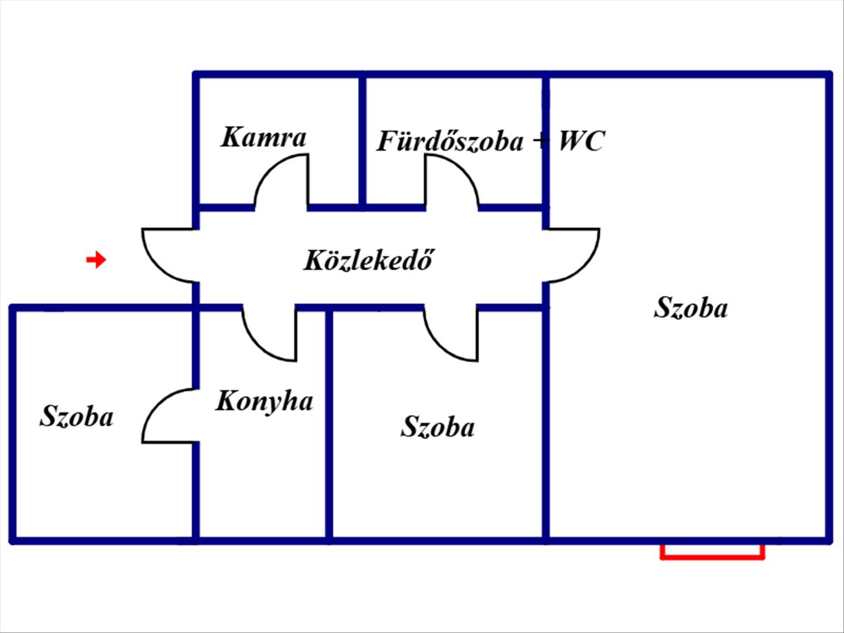 Élettér: két kisebb és egy nagyobb szoba, konyha + étkező, fürdőszoba + wc, kamra, közlekedő.