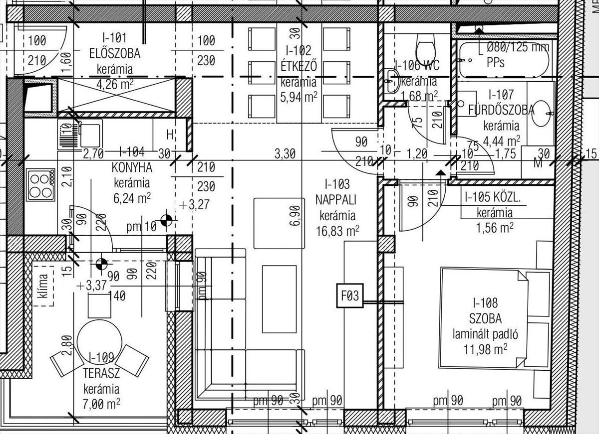 53 m2-s, Nappali, étkező, konyha, fürdő- wc, hálószoba. 7 m2-s terasz