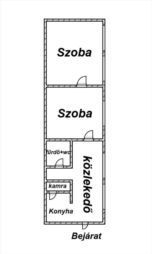 - Elosztása: 2 szoba, konyha, fürdőszoba+ Wc ( egy helyiségben van ), kamra. Erkély nincs.