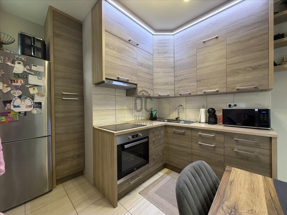 A modern, gépesített beépített konyhabútor a vételár részét képezi, így az új tulajdonos számára azonnal költözhető. a lakás klímával felszerelt, a kellemes hőmérsékletről pedig gazdaságos gáz cirkó fűtés gondoskodik.