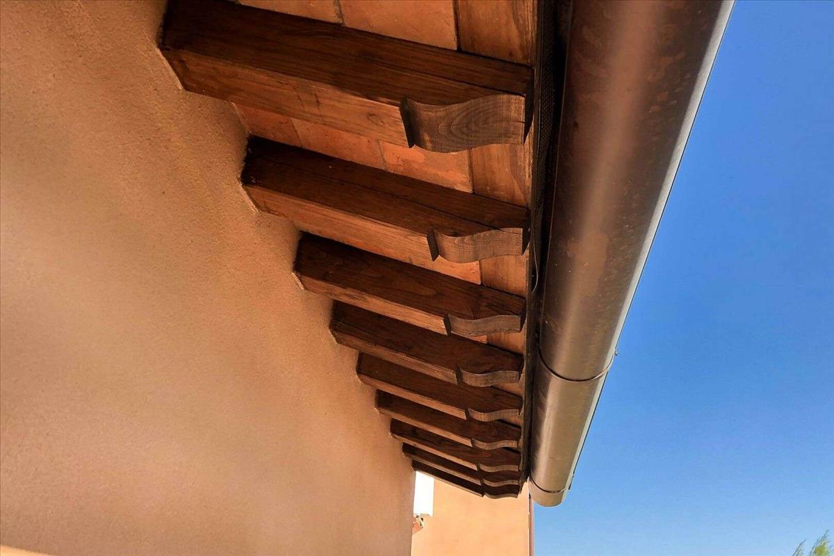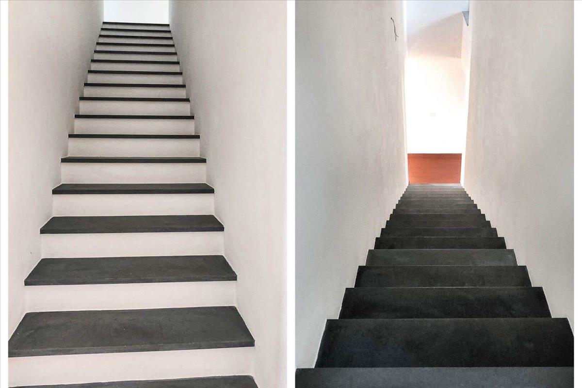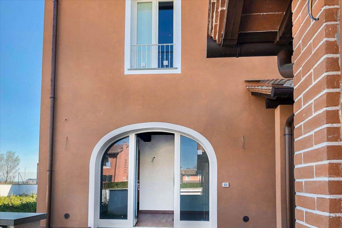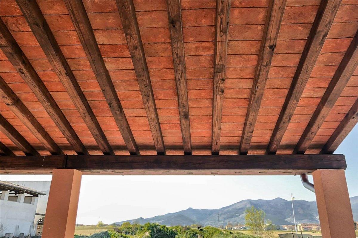 A félkarú ház két emeletes, három oldalról ingyenes, és a kertből egy lenyűgöző 50 négyzetméteres portico nyílik. Terra di Siena színes mázas homlokzatok és téglafelületek. A belső mennyezetek tömör fa gerendákkal és terrakotta lapokkal készültek. Modern és elegáns, könnyű fa ívelt francia ajtók, dupla termikus üveggel és fa redőnyökkel. A nappali a földszinten nyitott, és testreszabható, illetve beépíthető egy erdőégő kandalló. A nappali kéménnyel felszerelt, és a telepítéshez egy erdőégő kandalló is elképzelhető; a konyha-étkező, a tanulmány és egy fürdőszoba zuhannyal és ablakkal várja a lakókat. Minden emeleten a nappali terakotta csempe borítja a padlót, míg a lépcső a felső emeleten sötét kő. Az első emeleten három hálószoba található: kettő kétágyas és egy egyágyas, mind parkettás padlóval, és egy fürdőszoba káddal és ablakkal. A bejárat előtt egy különálló épület, pajta stílusban, jellegzetes terrakotta finishings a falakon, garázsként használható dupla hozzáféréssel és egy felülre nyíló garázsajtóval.