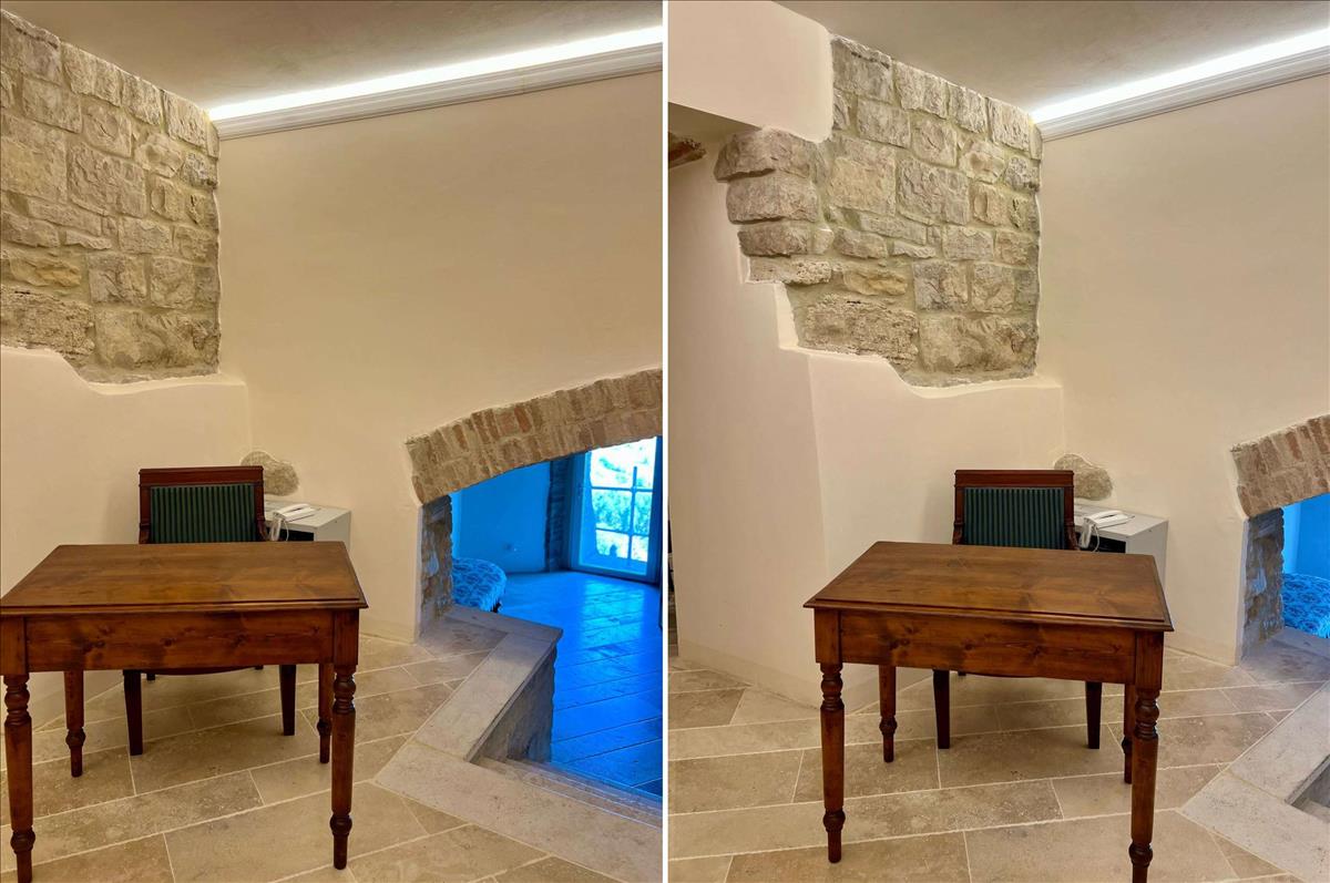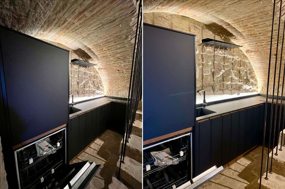 A 235 m²-es, nemrég teljesen és ízlésesen felújított terület az alábbi elemeket tartalmazza: bejárat terrakotta lépcsőházzal, egy nagy nappali konyha sarokkal, három kétágyas hálószoba, mindegyikhez saját fürdőszoba, szauna és törökfürdő, mosoda, és lejjebb egy nappali erkélyes kilátással a völgyre. A boltíves téglamennyezet különleges hangulatot teremt.