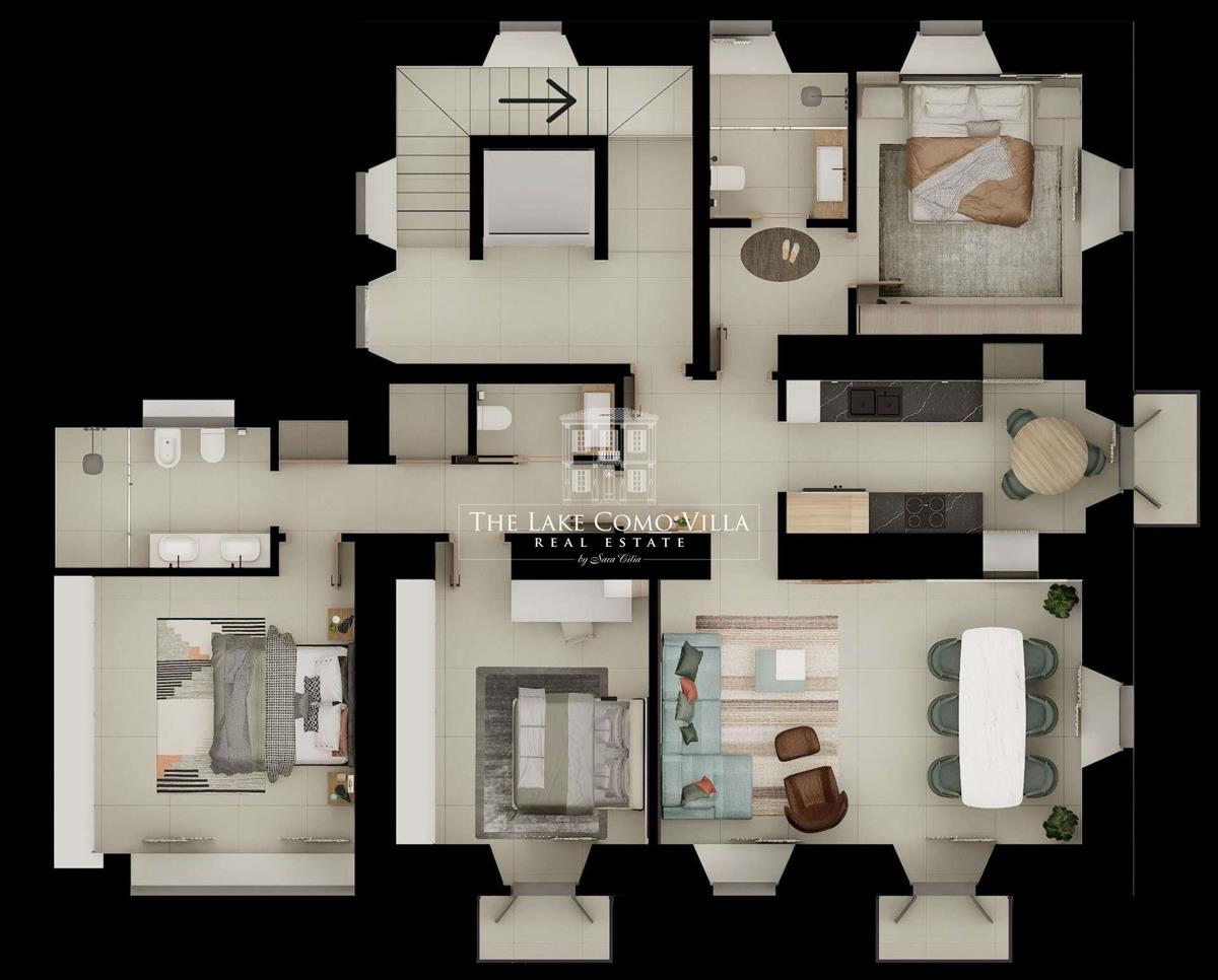 Az elrendezés egy nyitott terű nappali–étkező–társalgó részt tartalmaz nyíló erkéllyel, egy külön konyhát, egy további erkéllyel, egy hálószobát saját en suite fürdőszobával és saját erkéllyel, egy második mesterhálószobát en suite fürdőszobával, és egy harmadik kétágyas hálószobát erkéllyel.
