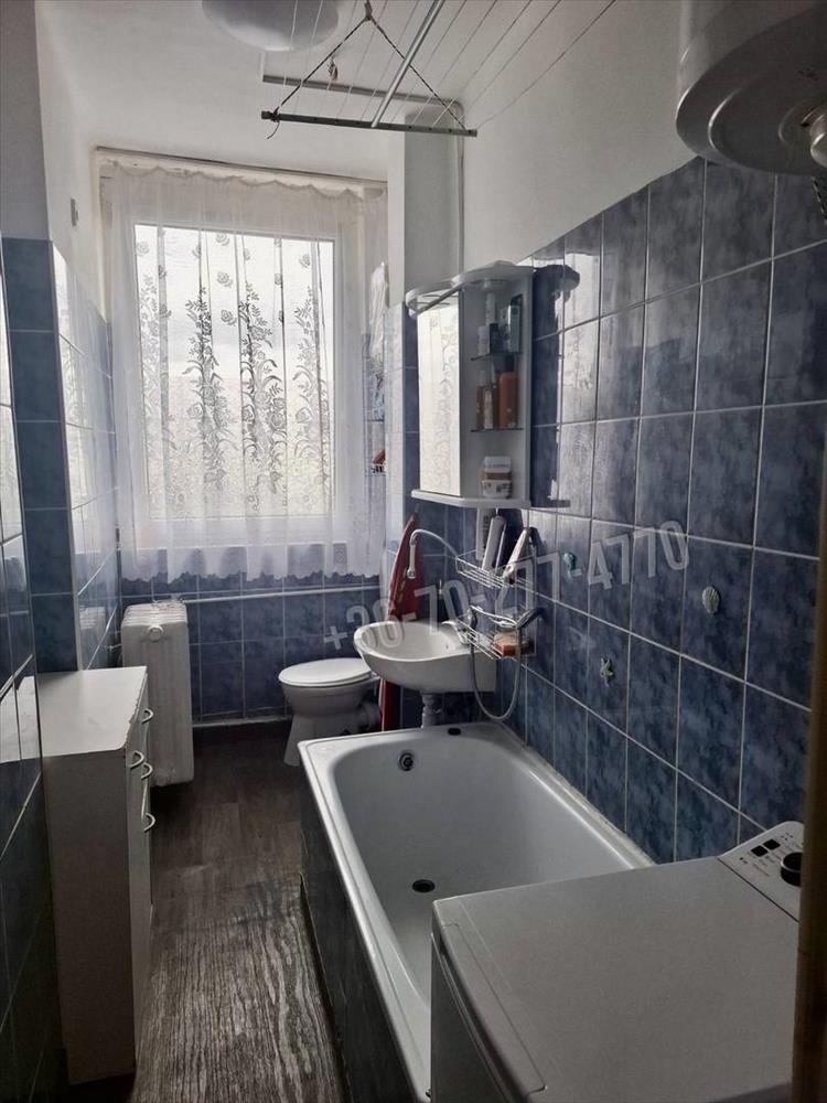 Az illemhelyiség a fürdőszobában az ablak mellett lett kialakítva, és kád található a mosdótálca mellett.