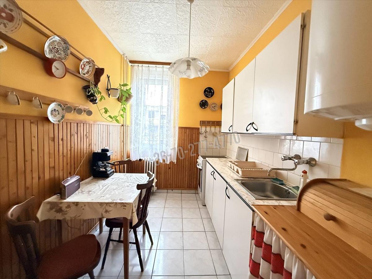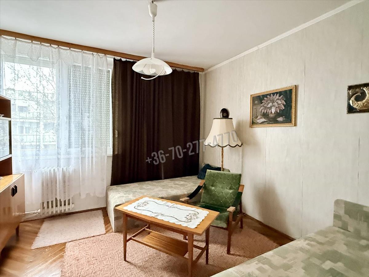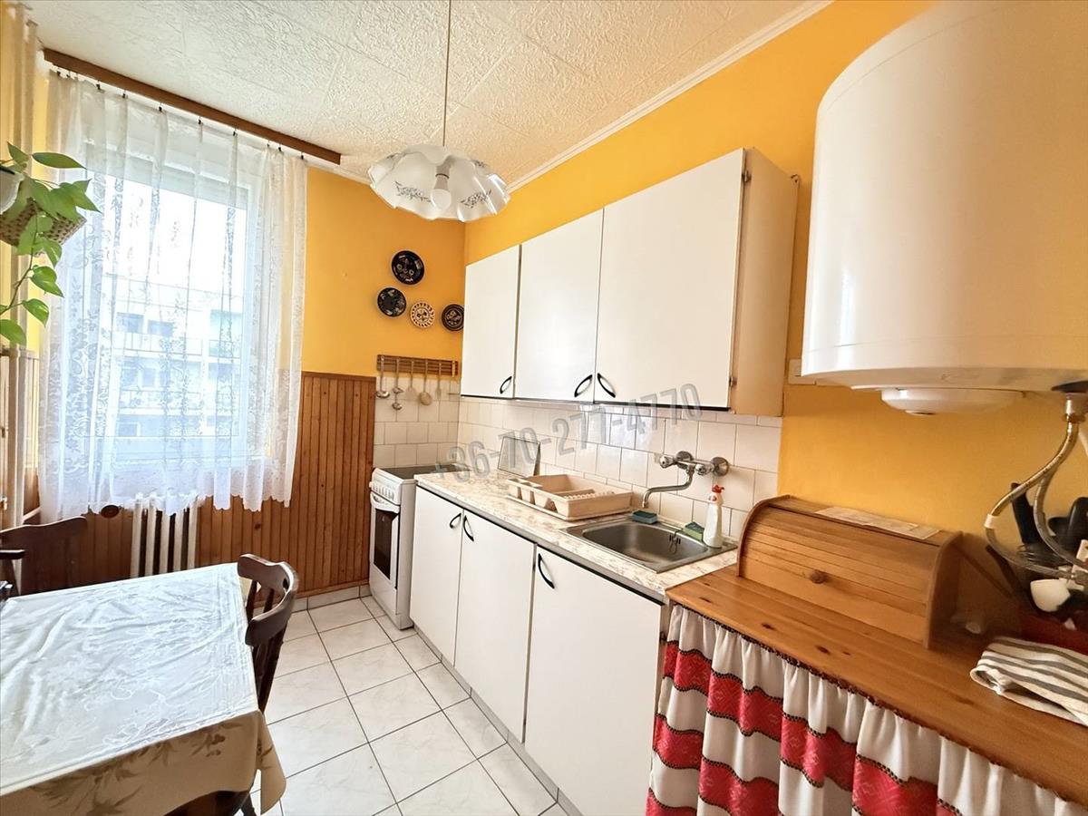 Elrendezését tekintve az előszoba fogad, innen nyílik a tágas nappali (17 m²), egy hálószoba, konyha, kamra, illetve egy fürdőszoba (káddal) és wc, valamint egy 5 m²-es, zöldövezetre néző erkély is tartozik hozzá. a helyiségek világosak, kiváló a benapozásuk és a kényelmet tovább növeli az összkomfort, a távfűtés (a radiátorok állítható szelepei és a hőmennyiségmérők felszerelése folyamatban - elnyert pályázat miatt többletköltség nélkül hamarosan megvalósul) és 2 rétegű thermoplan ablakok. a melegvizet villanybojler állítja elő, mely éjszakai kedvezményes villanyórára van kötve és a konyhában lett elhelyezve.