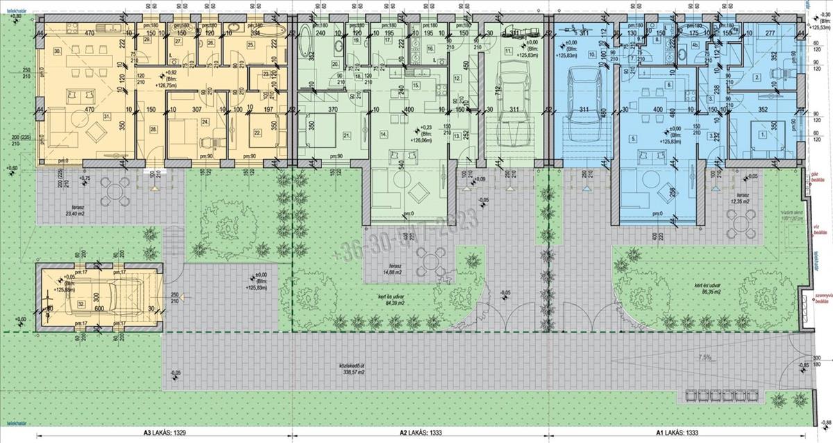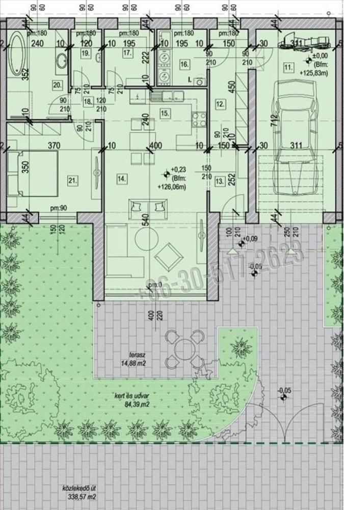 A kertkapcsolatos kialakításnak köszönhetően az új tulajdonos kényelmét növeli még a lakás előtt található kizárólagos használatú 84, 39 m2-es előkert és udvar, a 14, 88 m2-es terasz és a telek hátsó részén található 121, 86 m2-es kertrész.