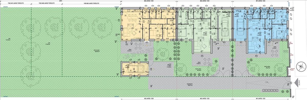 A 75 m2-es földszintes lakásban a képeken látható alaprajz szerinti elrendezésben két tágas hálószoba, egy nagy és világos nappali-konyha, garázs 22, 14 m2, háztartási helyiség, kamra, fürdőszoba és külön wc is kialakításra kerül.