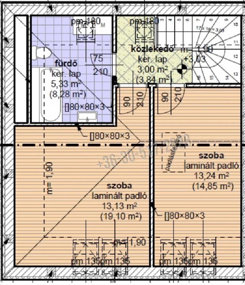 A lépcsőházon át a tetőtérbe érve két tágas hálószoba és egy kényelmes méretű fürdőszoba lesz kialakítva.