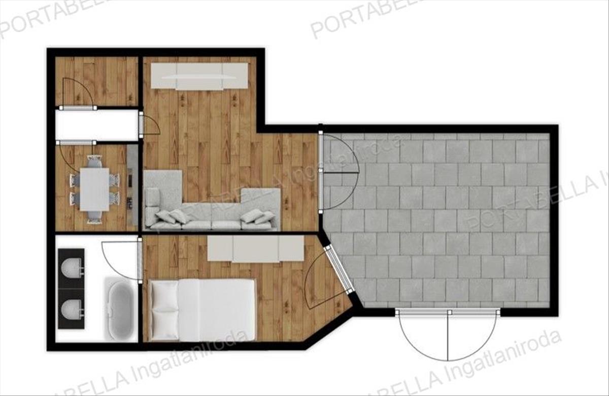 • 62 m²-es lakótér: 2 szoba, konyha, fürdőszoba, külön tároló
