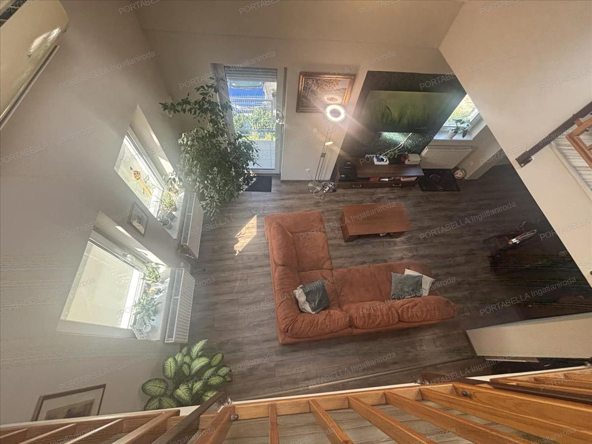 Az ingatlan egyik különlegessége a több mint 5 méteres belmagasságú nappali, amelyből a galéria és a felső folyosó látványa egyedi térélményt ad, szinte családi ház hangulatát idézve.