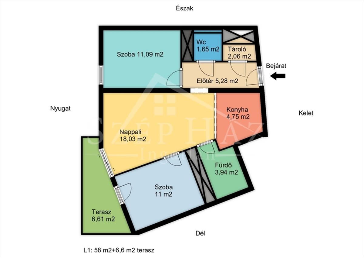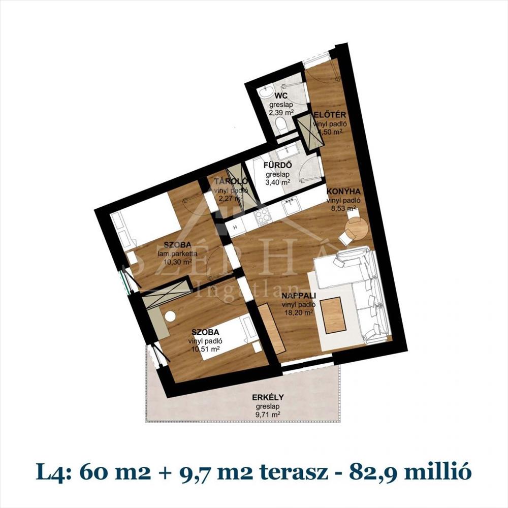 2 külön bejáratú szoba, amerikai konyhás nappali, külön fürdő és külön wc, valamint egy 6, 6 m²-es terasz biztosítja a kényelmet és a jó helykihasználást.