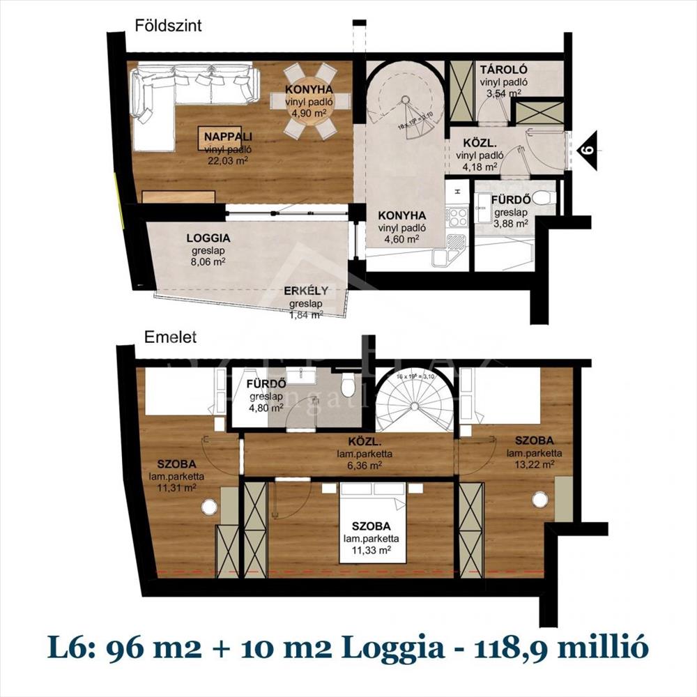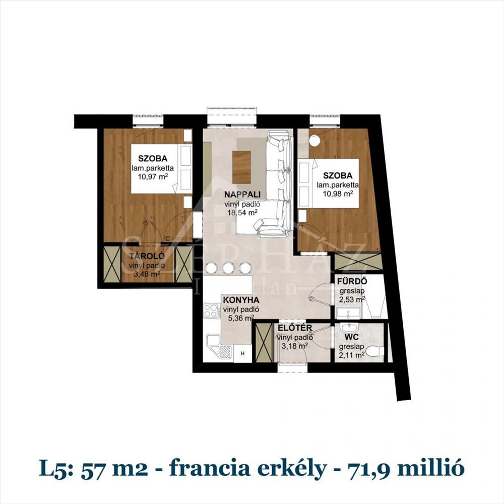 A konyha, fürdő és wc kerámia burkolatú, míg a lakótér minőségi laminált parkettát kap.