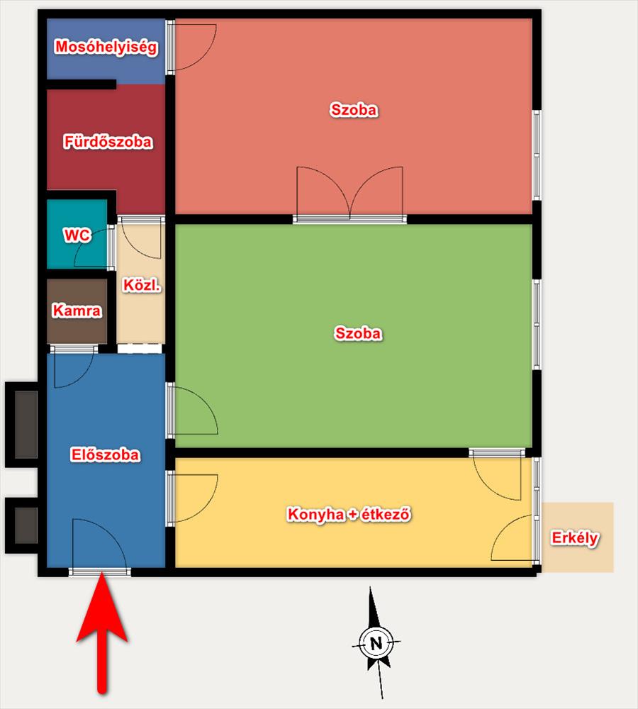 -66 m2: 2 szoba, előszoba, konyha, erkély, fürdőszoba, wc, közlekedő, kamra;