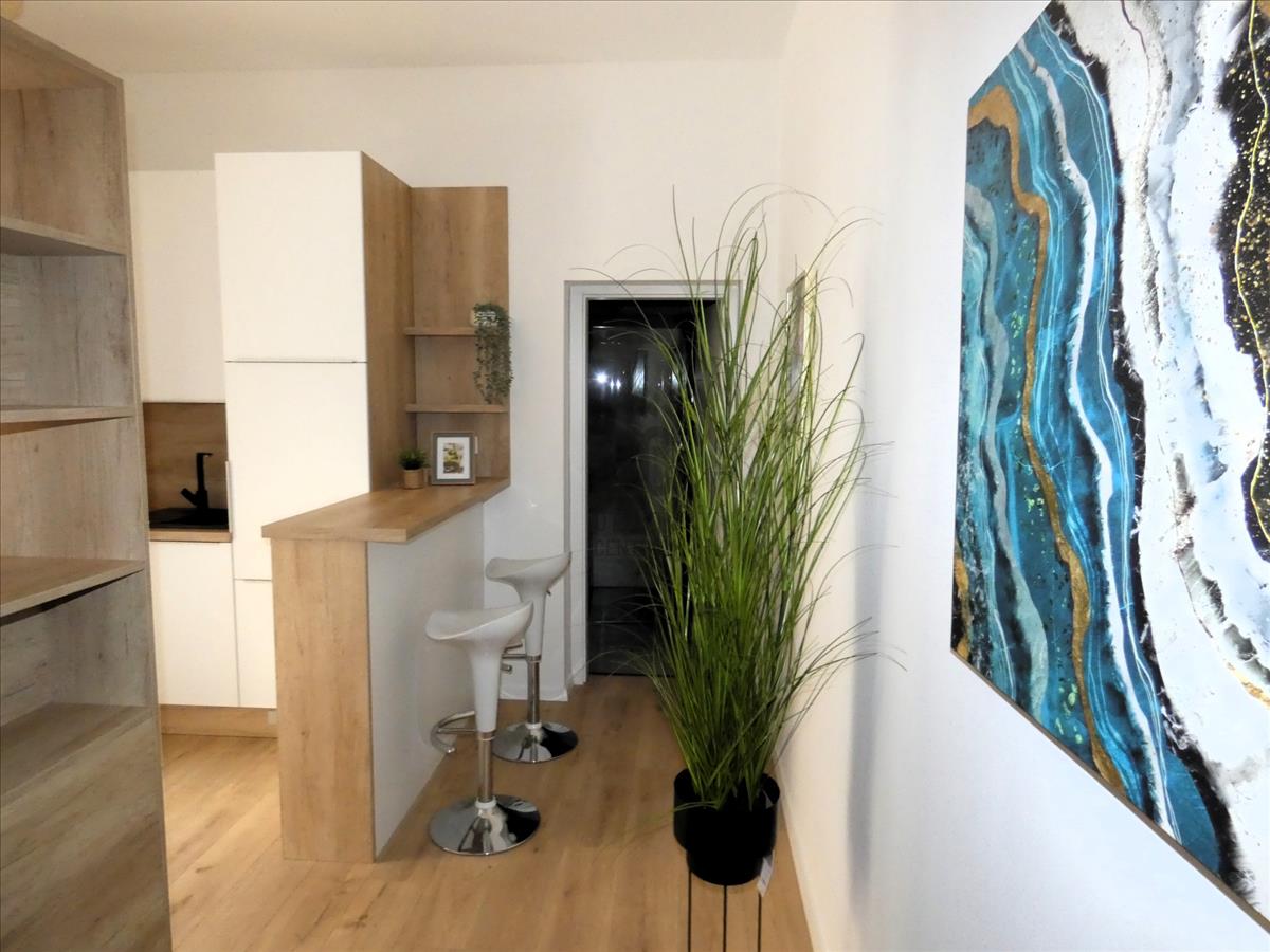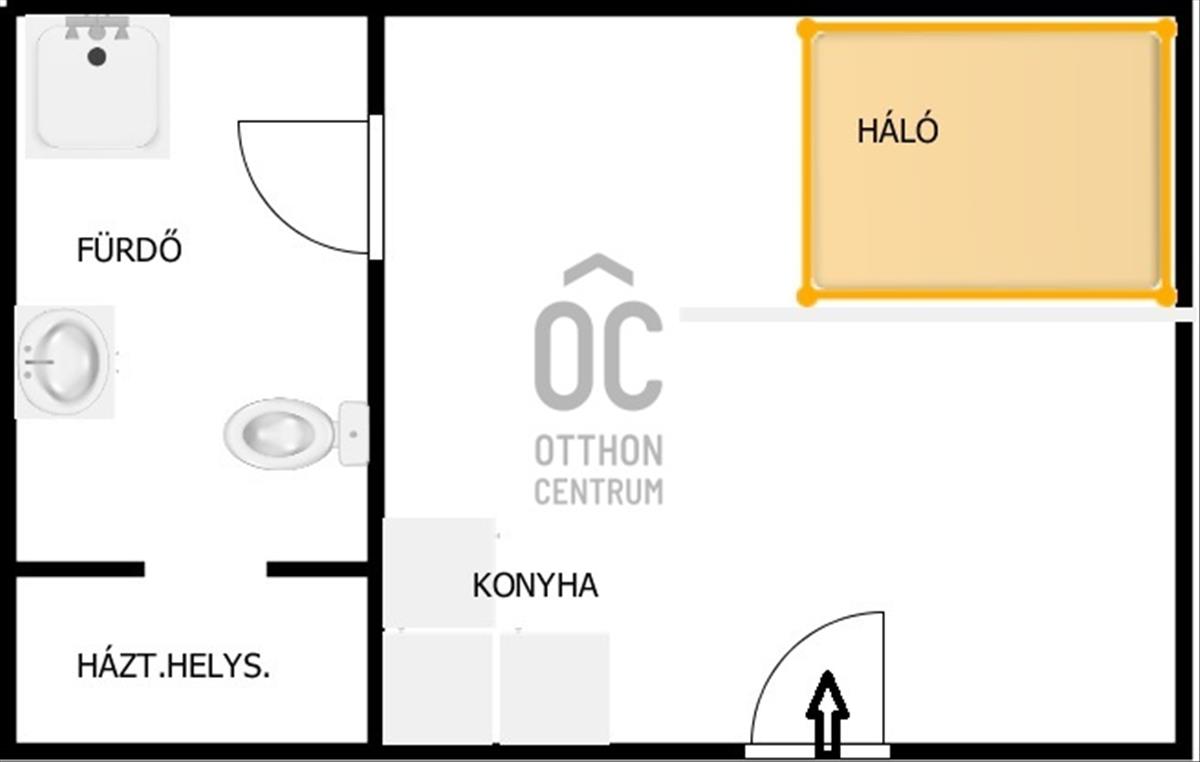 Nagy méretű szoba, melynek egy része hálósaroknak van leválasztva. a konyhasarok teljesen gépesített. a fürdőszobában épített zuhany lett kialakítva.