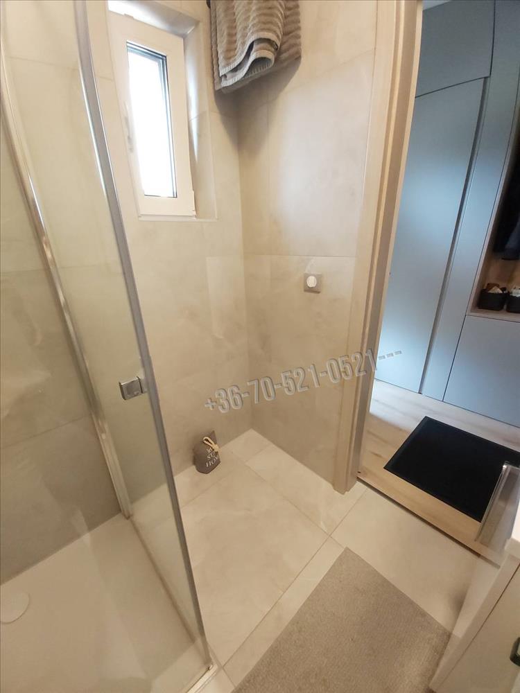 Az alsó szinten további zuhanyzós fürdőszoba wc-vel található, gardrób helyiség, mosókonyha-háztartási helyiséggel, illetve a lakás ékessége, a konyha-étkező-nappali, melyből szintén egy teraszra illetve a 275 m2-es kertbe jutunk ki.