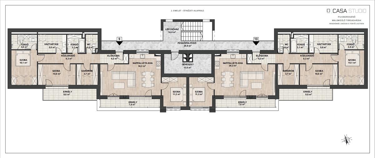 B9-B10 lakás: 96nm alapterület, Nappali+3 hálószoba+ gardrób, duplakomfort, 17nm -es erkély