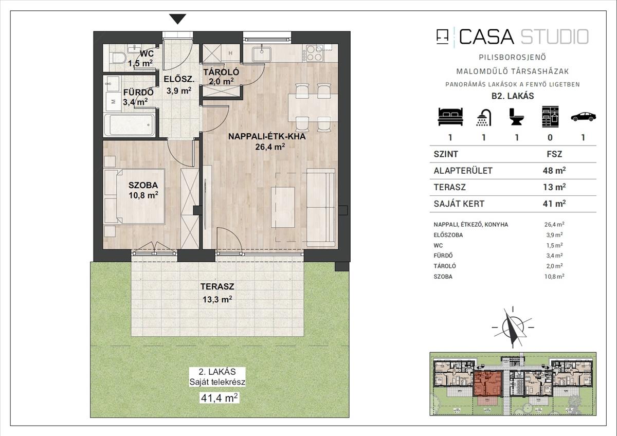 B2-B3 lakások: 48nm alapterület, Nappali+1 hálószoba, 8nm burkolt terasz, 41nm saját kert - (4m ft)