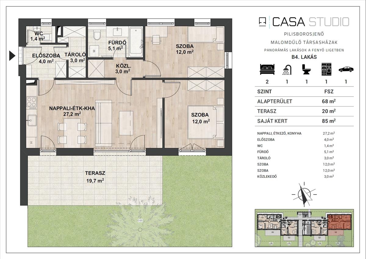 B1-B4 lakások: 68nm alapterület, Nappali+2 hálószoba, 24nm burkolt terasz, 85nm saját kert – (6m ft) (2wc)