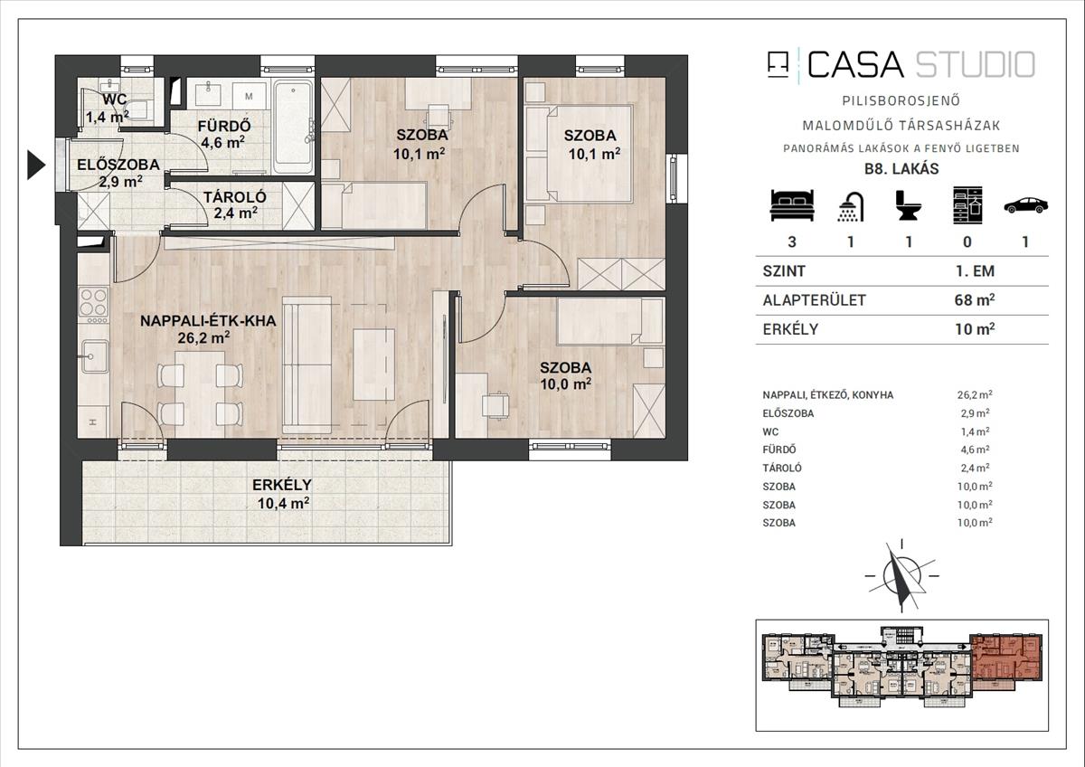 B5-B8 lakások: 68nm alapterület, Nappali+3 hálószoba, 10nm -es erkély