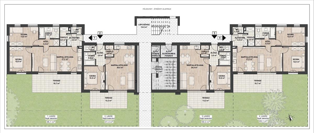 B1-B4 lakások: 68nm alapterület, Nappali+2 hálószoba, 24nm burkolt terasz, 85nm saját kert – (+ 6m ft) (2wc)