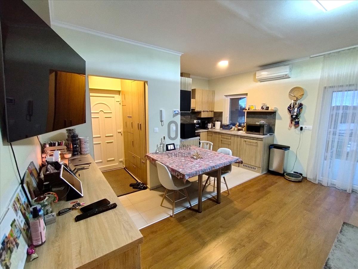 A lakásban található beépített bútorok és szekrények nemcsak praktikusak, hanem elegáns megjelenést is kölcsönöznek a térnek. a tágas nappali és az amerikai konyha ideális helyszín a családi összejövetelekhez, baráti találkozókhoz.