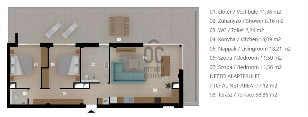 Az ingatlan alapterülete 77 nm, ami tökéletes méret egy család számára. a lakás 3 szobával és 1 fürdőszobával rendelkezik, így mindenki kényelmesen elfér.