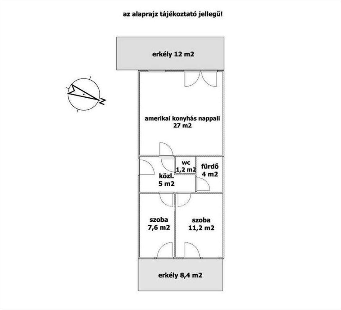 Minden szoba teraszkapcsolatos, a két hálószoba a keleti (8 m2), az amerikai konyhás nappali a nyugati (12 m2) teraszra nyílik.