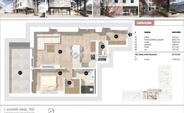 1. /2. 54 m2 + 14 m2 terasz: előtér-konyha+nappali+étkező-hálószoba-gardrób-fürdő-WC-14 m2 terasz.
